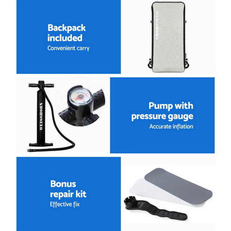 Our Weisshorn Stand-up Paddle Board is designed to suit the beginner paddler as well as a seasoned and easily fits both paddler and passenger for hours of maximum enjoyment. Better still, it is made from durable drop-stitch core material and easy to inflate and deflate, with similar build qualities that you will find with its pricier fibreglass counterparts. It maintains rigidity and toughness with a thickness of 15cm and has a weight capacity of up to 185kg. The supplied 1.7m adjustable aluminium paddle is highly versatile in both paddling and steering while the three fins underneath the board ensure steady gliding, easy manoeuvrability and smooth turning. In fact, one of the fins is removable to give better directional stability. Getting your aquatic escapades started with the paddle board is a simple task of inflating it with the included pump and you are good to row. And because it can be packed away into its handy travel bag, you can take the paddle board just about anywhere you want to go for your water adventures. Also included is a repair kit and a quality adjustable kayak seat that can turn your paddle board into a kayak to enhance your comfort. The kayak seat also comes with a free detachable seat bag where you can conveniently place your personal belongings.